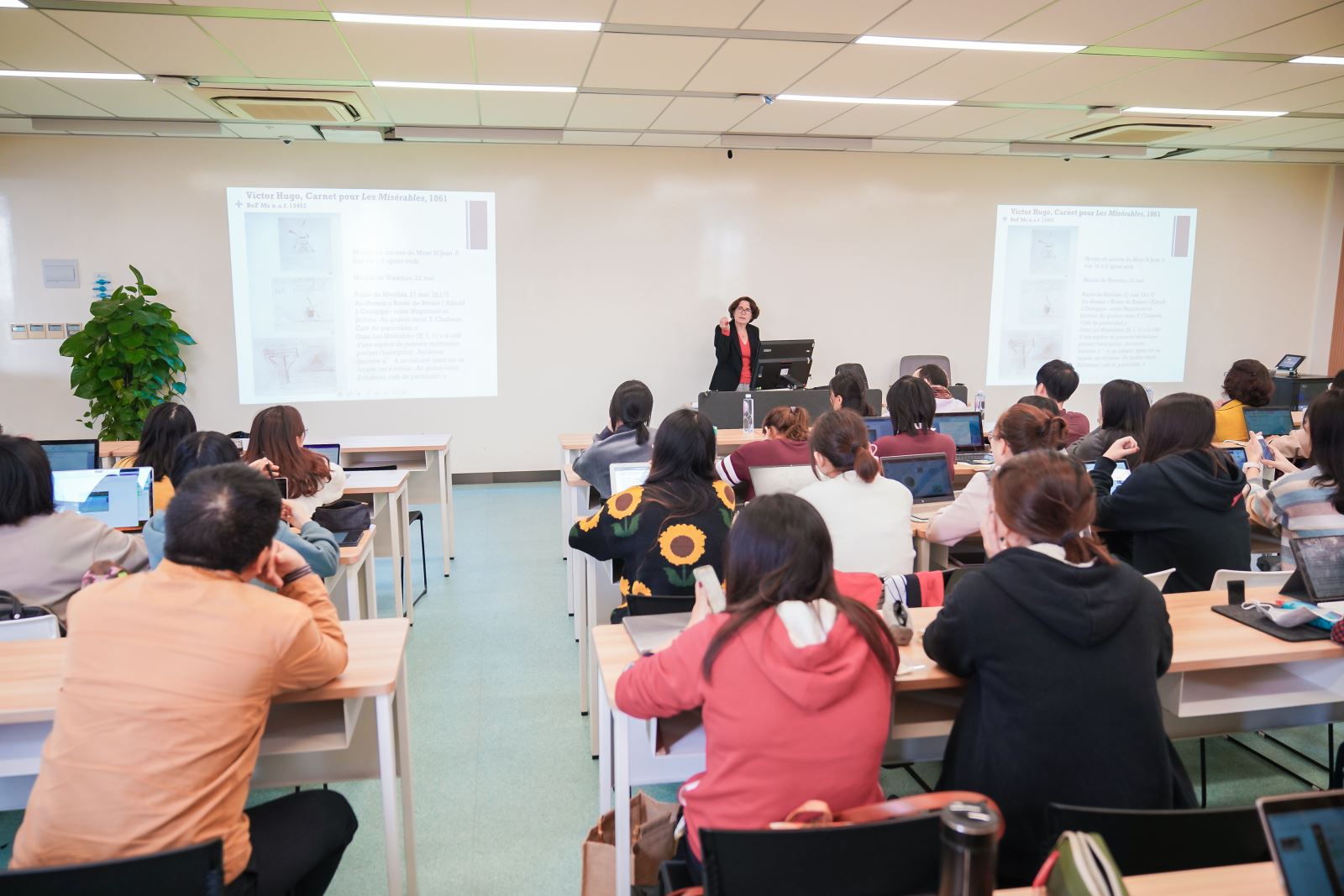2019年10月29日上午,绅士漫画 法文系成功举办了“天才的内心 ——雨果的绘画与文学”主题讲座,主讲人是法国格诺布尔·阿尔卑斯大学文学教授Delphine Gleizes女士。法文系主任袁莉老师主持了本场讲座,上海市明珠美术馆提供技术支持。