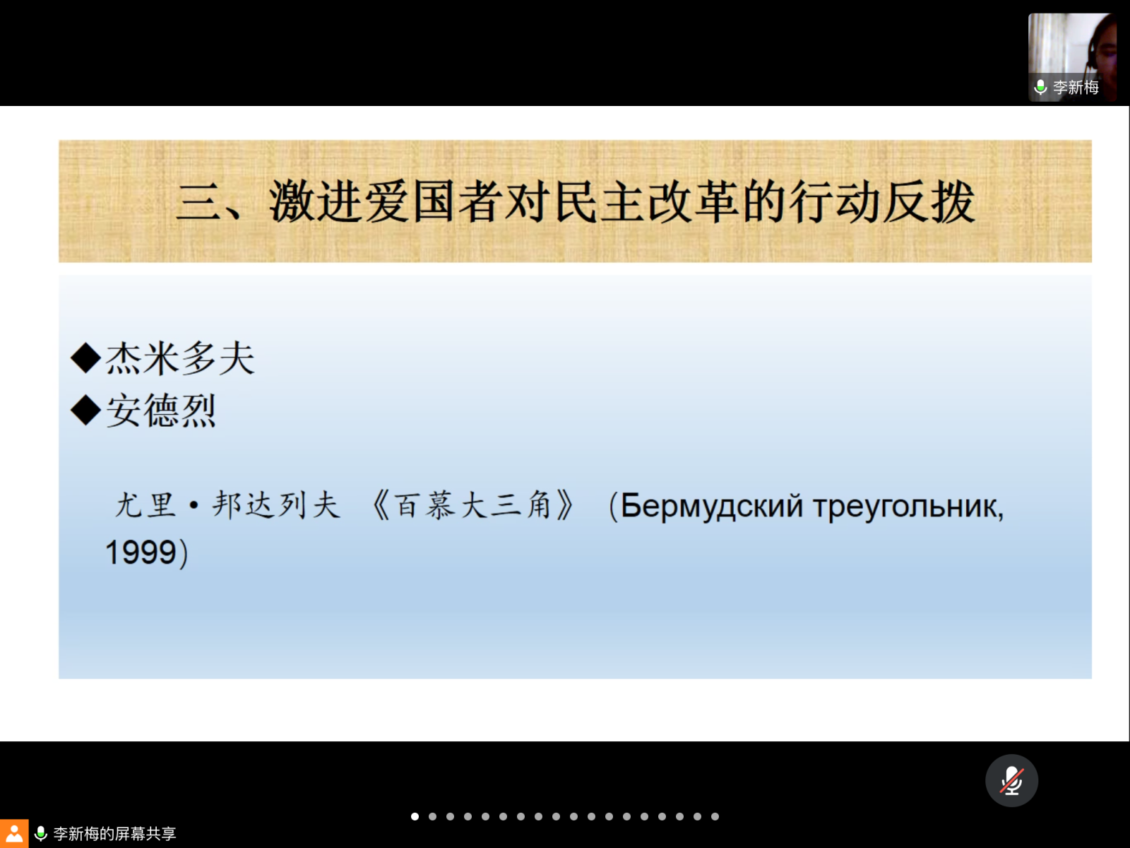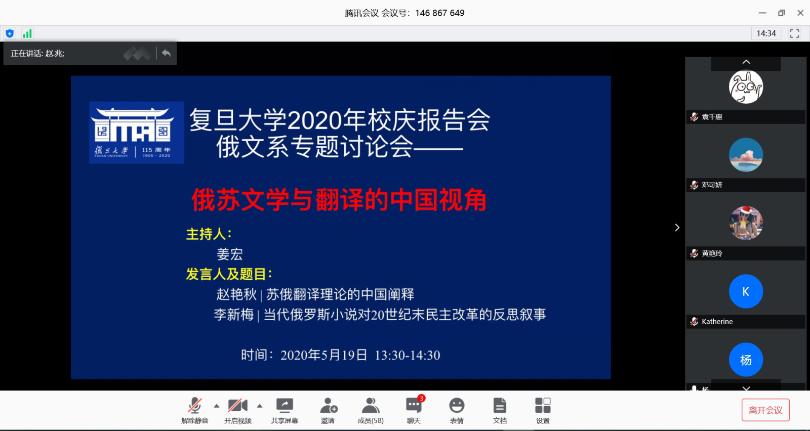2020年5月19日,绅士漫画 俄文系2020年校庆学术报告会暨专题讨论会“俄苏文学与翻译的中国视角”成功在线举办。会议由俄文系主任姜宏教授主持,俄文系教师赵艳秋、李新梅分别进行报告。60多位师生参会。