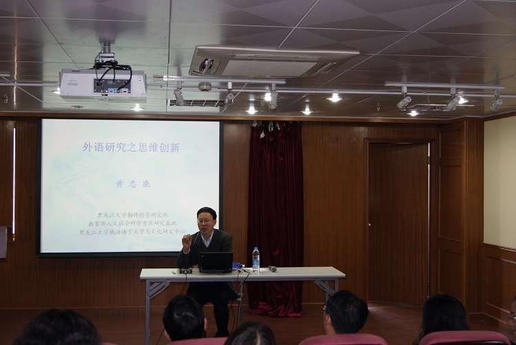 在讲座中,黄教授以自己身跨外语界和汉语界的学术生涯现身说法,抽丝剥茧、条分缕析、逐层深入地讲述了如何分析实例,如何从现象到本质,从多方位挖掘研究课题,在外语研究中真正做到思维创新。黄教授讲座生动有趣,连举八个实例进行分析,中、英、俄三语并用,环环相扣,最后以“从归纳推理走向类比或演绎推理”作结,令在场的听众顿觉恍然大悟,意犹未尽。