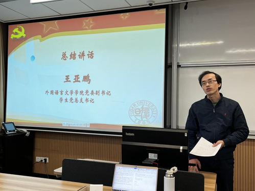 接着,学院党委副书记、学生党总支书记王亚鹏作总结讲话。他表示,今年是中国共产党成立一百周年。党的历史是最生动、最有说服力的教科书。他援引习近平总书记的话强调,历史是最好的老师,我们党的历史是中国近现代以来最为可歌可泣的篇章。广大党员要以学习党史为重点,做到知史爱党、知史爱国。习近平总书记在考察清华大学时指出,广大青年要爱国爱民,要锤炼品德,要用于创新,要实学实干。青年学生要心怀“国之大者”,坚定前进信心,立大志、明大德、成大才、担大任,努力成为堪当民族复兴重任的时代新人。王亚鹏对学员提出了四个要求:一是学史明理,就是要求各位学员进一步加强党史学习,增强用党的创新理论武装自己的政治自觉。二是学史增信,就是要求各位学员进一步把握历史规律,增强对共产主义理想和中国特色社会主义的政治信仰。三是学史崇德,就是要求各位学员进一步继承革命传统,增强党员的先锋模范意识。四是学史力行,就是要求各位学员进一步坚持人民立场,增强践行群众路线的初心宗旨。江山就是人民,人民就是江山。最后,他对学生入党积极分子提出要求,希望同学们争取早日加入党组织。
