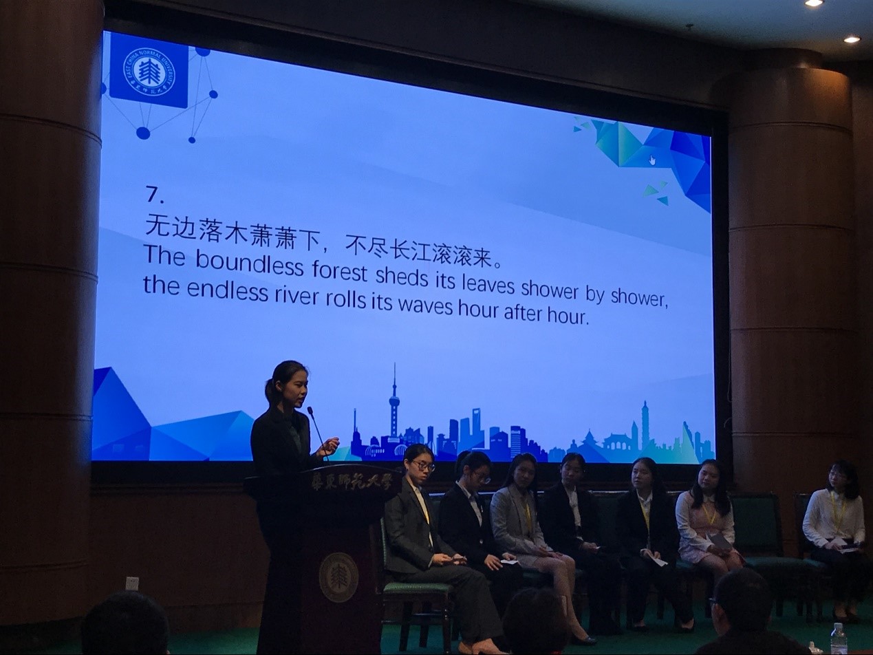 演讲赛分为初赛、决赛两轮,由即兴演讲和问答两环节组成,初赛总分排名前八的选手晋级决赛。寿晨佳、傅之君双双晋级演讲总决赛八强。在决赛中,傅之君抽到“无边落木萧萧下,不尽长江滚滚来”的高难度题目,在场的评委都为她捏了把汗。然而她却举重若轻,旁征博引,用精彩、独到的阐释和强大的气场赢得了全场的喝彩,收获了一大帮粉丝。寿晨佳同学也发挥稳定,结合自己学习翻译的亲身体会,稳健地诠释了“纸上得来终觉浅,绝知此事要躬行”的命题。辩论赛按校组队,在上午两轮初赛中表现出色的绅士漫画 队遗憾止步下午的四分之一决赛。但是几位同学在比赛中磨炼了技巧、增进了配合,也用流利的英文表达、敏捷的反应和侃侃而谈的风度给评委老师留下了深刻的印象,获得团队最佳风采奖。