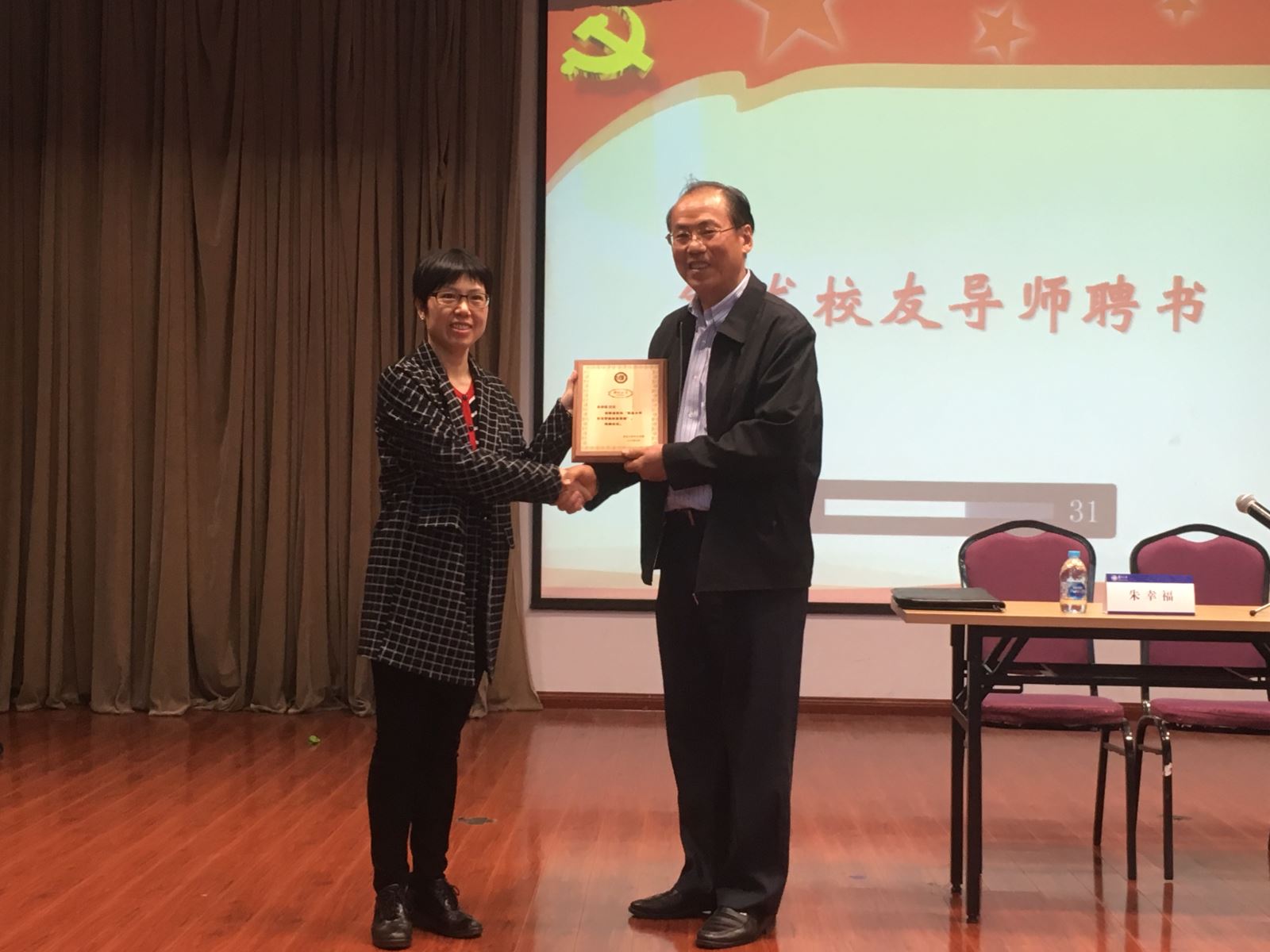 讲座前,分党委书记罗英华为朱幸福 校友颁发了校友导师聘书,感谢其对于学院党建工作和育人工作的大力支持。