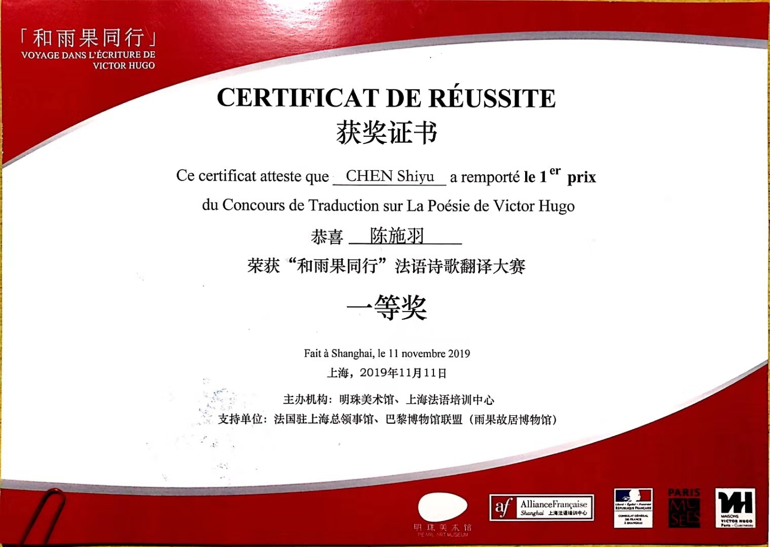 2019年11月11日,“和雨果同行”诗歌翻译大赛颁奖典礼在上海明珠美术馆·心厅隆重举行。经过层层选拔,复旦绅士漫画 法文系本科三年级学生陈施羽同学在众多参赛选手中脱颖而出,成功荣获诗歌翻译大赛第一名,并在颁奖礼上朗读自己的译文,与在场的观众和获奖选手们共同感受诗歌语言的魅力。