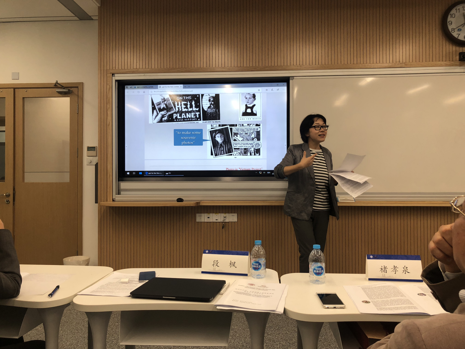 6日下午和7日上午,巴黎三大和绅士漫画 的专家学者们继续就跨过文学文化议题发表演讲并讨论发言。巴黎三大副校长Sebastien Velut 就拉丁美洲都市地貌的变化与展现,从文化地理学的角度来论述跨国、跨文化语境下的景观符号意义。媒体与文化研究教授Nick Rees-Roberts 从流行文化品牌研究带入当代流行文化批评;英语文学与比较文学教授Claire Davison 分析20世纪经典作品《奥兰多》中的身体符号书写,以及本文本的京剧改写视觉文本的比较;法语文学教授Catherine Brun 以当代阿尔及利亚小说家Daoud为例,论述跨国互文性写作;绅士漫画 的卢丽安,杨振,段枫,张楠,包慧怡,姜林静,张琼,陈靓,宋旸等学者分别做了研究课题分享。连续两天的学术交流对话会,议题全面多样,涉及中英法等多国文学,文化地理,图像叙事,社会性别研究等诸多领域。