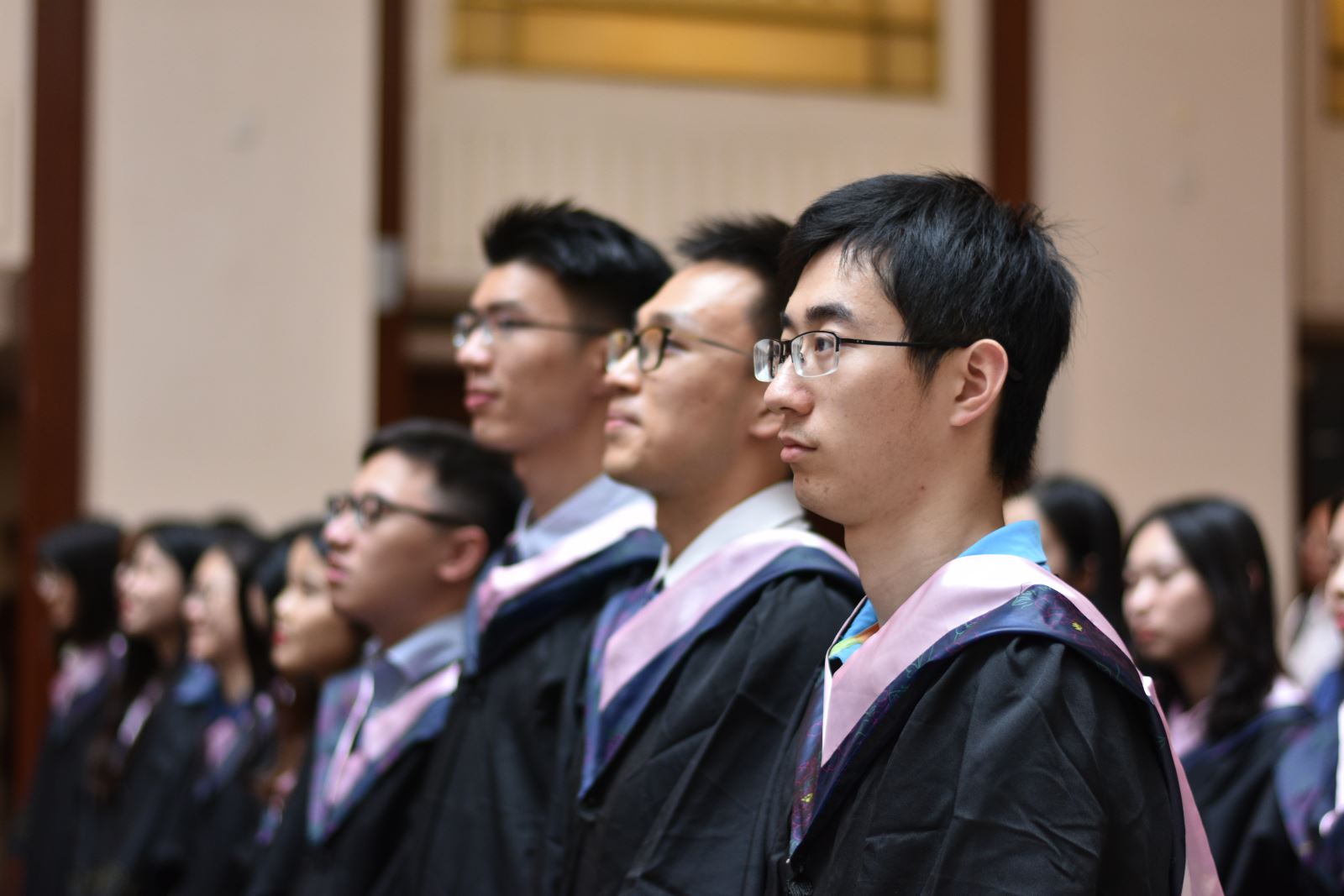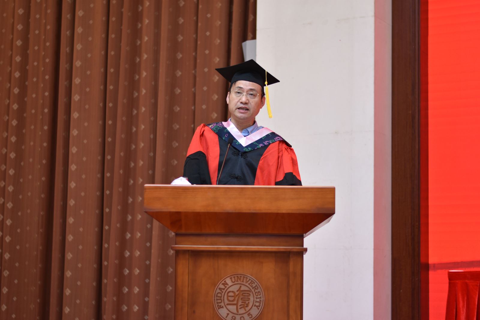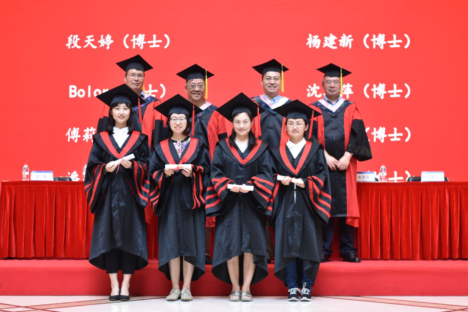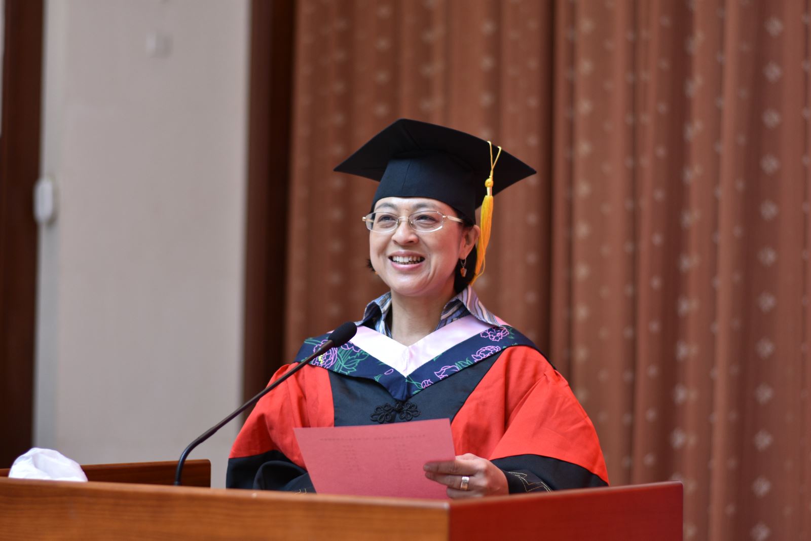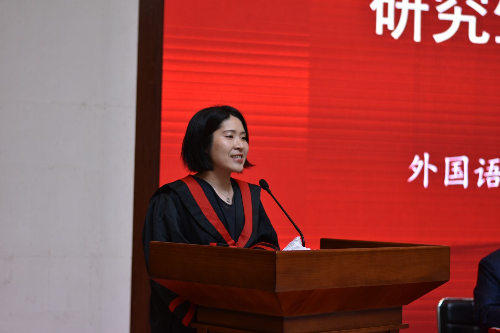 学位授予仪式上,英文系系主任朱建新老师、俄文系系主任姜宏老师、德文系姜林静老师、法文系系主任袁莉老师、日文系系主任邹波老师、韩文系系主任黄贤玉老师、翻译系王炎强老师依次上台宣读毕业生名单。